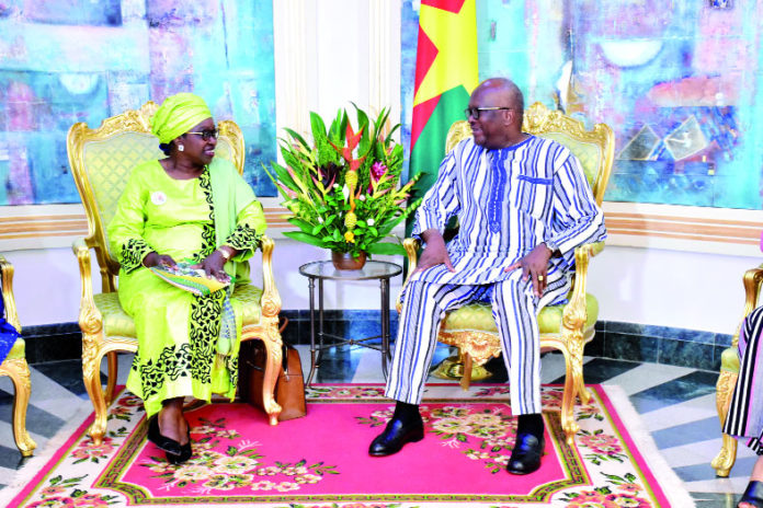 L’envoyée spéciale du président de la commission de l’Union africaine (UA) pour les femmes, la paix et la sécurité, Ndeye Bineta Diop et sa délégation ont rendu une visite de courtoisie, le mercredi 29 mai 2019, au chef de l’Etat, Roch Marc Christian Kaboré. A travers cette visite, a fait savoir Mme Diop, la délégation a voulu montrer au monde entier que malgré la situation difficile que traverse le pays des Hommes intègres, l’Afrique trouvera des solutions adéquates. Selon elle, le Burkina Faso est également en train de mettre en œuvre des solutions de sécurité et de protection des populations. «Nous avons partagé avec le président, notre agenda de femme, paix et sécurité, ainsi que des solutions que les femmes préconisent à la base et dans les communautés. Le Sahel nous préoccupe, parce que si cette région est en paix, l’Afrique le sera, le monde aussi», a confié Bineta Diop. Pour l’envoyée spéciale, les femmes sont résilientes et elles veulent faire partie des solutions. «Nous avons tendance à trouver des solutions superficielles. Maintenant, il faut aller à l’intérieur des problèmes, comme ceux des frontières. Et les femmes sont là, pour faire le plaidoyer», a-t-elle fait savoir. A l’entendre, les femmes veulent avoir des plateformes d’échanges avec les militaires, car la solution, elle, est également humaine et les communautés doivent aussi s’impliquer pour combattre l’ennemi commun, le terrorisme. Faisant l’état des lieux des femmes et des enfants victimes des attaques terroristes, Mme Diop a précisé qu’avec la ministre en charge de l’action humanitaire burkinabè, des échanges ont été menées pour chercher des pistes de solution, afin d’améliorer leurs conditions de vie.