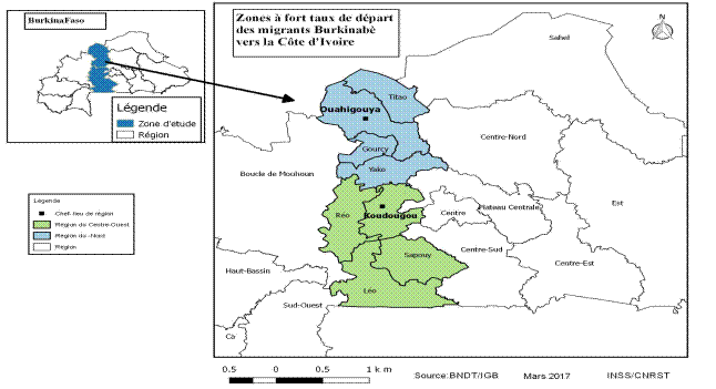 Cette étude a été réalisée dans le cadre d’un programme pluridisciplinaire (PreSeD/CI) de recherche dont l’objectif est de développer des connaissances sur les conséquences des crises politico-militaires des années 2000 en Côte d’Ivoire sur les dynamiques des paysages naturels et la disponibilité des terres pour l’agriculture de subsistance. Une méthodologie mixte (quantitative et qualitative) a été adoptée ciblant les émigrés exploitant des plantations cacaoyères de retour temporaire au Burkina et en Côte d’Ivoire. Les enquêtes se sont déroulées au Burkina Faso (régions du Yaadga et de Nando) et en Côte d’Ivoire (centre-ouest) dans la sous-préfecture de Dania. Au Burkina, les enquêtes ont mobilisé 120 émigrés œuvrant dans la production cacaoyère tandis qu’en Côte d’Ivoire une quinzaine d’entretiens avec les ménages burkinabè exploitant des plantations de cacao ont été réalisés.