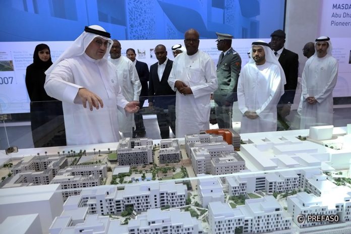 Avant de quitter Abu-Dhabi au terme de deux jours visite d’amitié et de travail, le jeudi 25 avril 2019, le président du Faso, Roch Marc Christian Kaboré Masdar s’est rendu sur le site de la Cité Masdar abritant l’Agence international de l’énergie renouvelable (IRENA), à 30 km à l’est de la ville d’Abou Dhabi. « Les générations futures doivent vivre dans un monde différent du nôtre. C’est essentiel que nous nous habituions nous-mêmes et nos enfants, à entrer dans ce nouveau monde ». C’est philosophie (frappé en grand sur un mur) du Sheikh Zayed bin Sultan Al Nahyan, père fondateur des Emirats arabes unis, guidant la construction de la Cité, qui a accueilli le chef de l’Etat et sa délégation une fois dans un des bâtiments. Ses hôtes lui ont expliqué que Masdar ou « source » en arabe est une écocité à vocation expérimentale dans les domaines des énergies renouvelables, des transports « propres » et de la gestion des déchets. Le projet est toujours en développement, les travaux ayant commencé en février 2008 pour accueillir 40 000 habitants à l’horizon 2030. La ville est appelée à devenir une ville modèle, la première cité avec une vie « sans émissions de carbone et sans déchets ». L’objectif de la ville est d’inciter étudiants, experts, hommes d’affaires, spécialistes de l’environnement et entreprises innovantes de tous les pays à venir s’y installer. Le Masdar Institute, dédié à la recherche, a été initié en 2007. Les premiers étudiants et chercheurs y ont investi une partie des lieux dès novembre 2010. Parmi les infrastructures et projets initialement envisagés dans le cadre de Masdar City, figurent la construction d’une centrale solaire d’une puissance de 100 mégawatts qui doit être ultérieurement portée à 500 MW, la couverture des toits de la ville de 5 000 m2 de panneaux photovoltaïques, le recours à l’hydrogène et à des agrocarburants issus de cultures utilisant les eaux usées pour remplacer les carburants fossiles et l’utilisation des eaux usées, après recyclage, pour l’irrigation des cultures destinées à l’alimentation. Ce recyclage de l’eau est censé permettre de réduire de 80% la consommation d’eau de mer dessalée dont la production nécessite une quantité importante d’énergie.