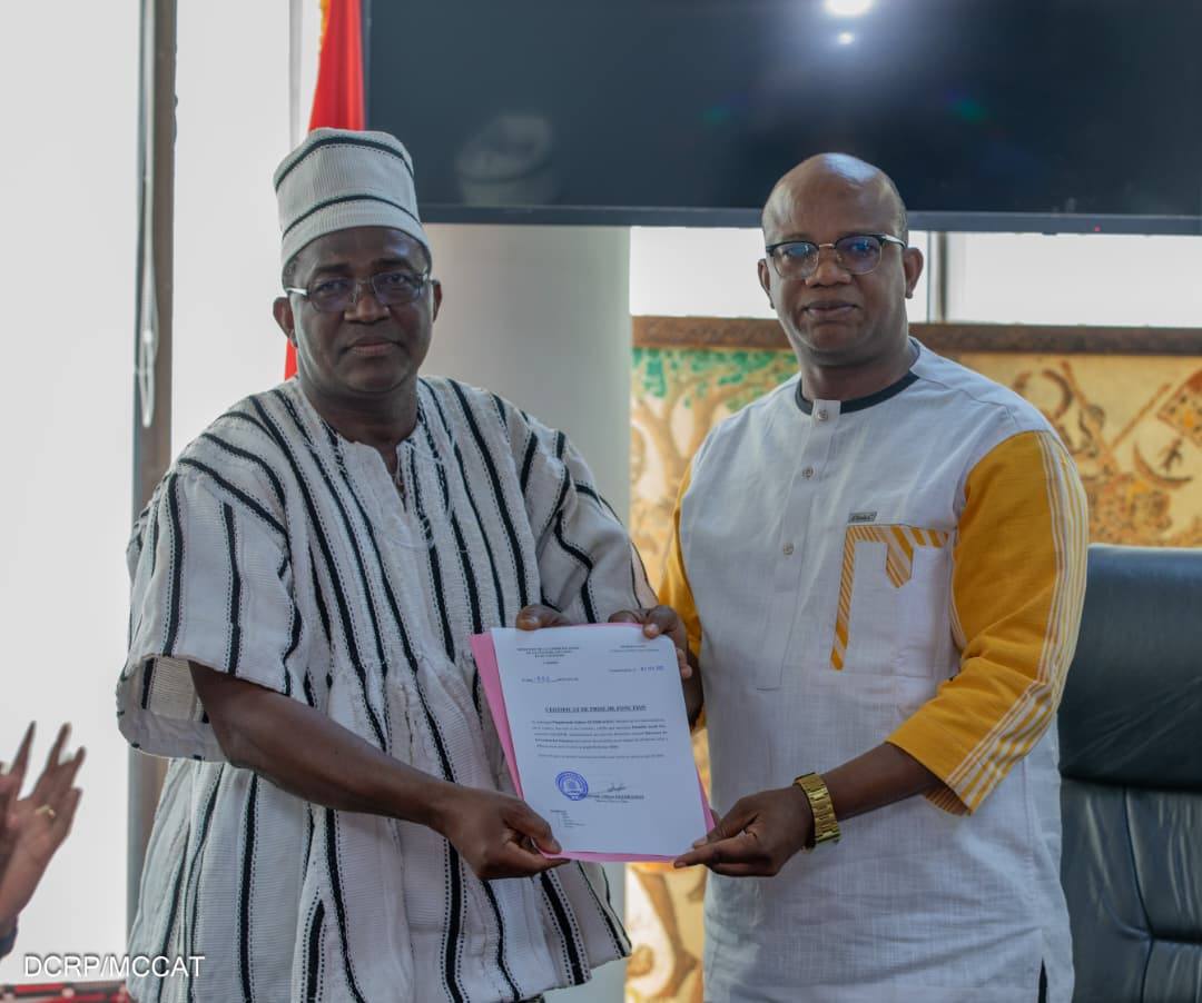 Le Directeur de Cabinet du Ministre de la Communication, de la Culture, des Arts et du Tourisme, Sy Christian OUATTARA a présidé la cérémonie de passation de charges entre les Directeurs de la Gestion des Finances (DGF) entrant et sortant, ce jeudi 5 février 2026.