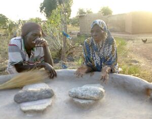 L’activité de moulage se déroule sur une sorte de terrasse aménagée, où chaque femme installe sa meule, appelée «neeré » en langue mooré. Cet espace devient un véritable lieu de rassemblement où les femmes se retrouvent ensemble ou individuellement pour écraser les céréales. Dans les sociétés africaines en général, la parole étant sacrée et ne devant pas être prononcée n’importe où, les femmes ont développé une littérature orale qu’elles