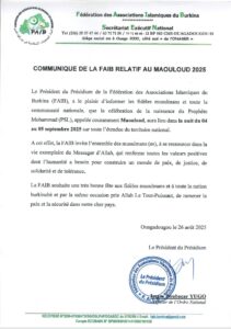 La fédération des associations islamiques du Burkina a annoncé, dans un communiqué, que la célébration du Mouloud aura lieu dans la nuit du 4 au 5 septembre 2025 sur toute l’étendue du territoire national.