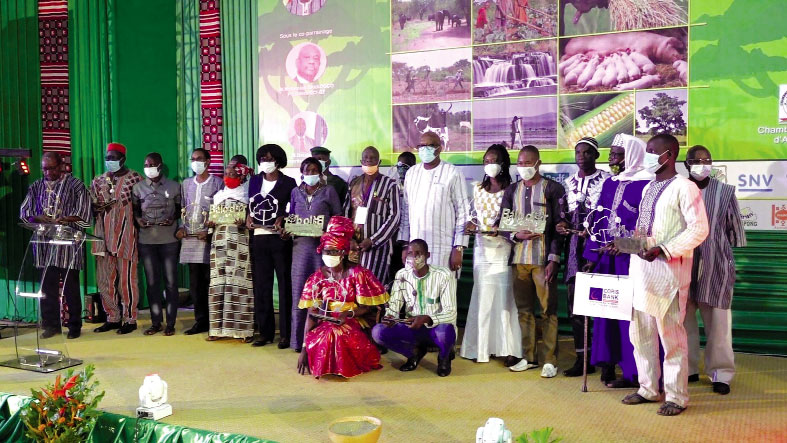 La 1re édition de la nuit de l’exploitant familial, ‘’Balo d’Or’’ a permis d’honorer une quinzaine d’acteurs du monde rural. Une initiative d’une coalition de 18 organisations de la société civile, dans le cadre de la mise en œuvre du programme Voix pour le changement, en partenariat avec le ministère de l’Agriculture et des Aménagements hydroagricoles. Trois prix ont été décernés dans chaque catégorie ; meilleur exploitant familial, meilleure exploitante familiale, meilleur jeune exploitant familial, meilleure organisation paysanne et meilleur technicien. Des trophées en or, argent et bronze, des enveloppes financières et du matériel agricole ont été remis aux lauréats. Dans la catégorie, meilleur exploitant familial, c’est Bassirou Siennou de la région de la Boucle du Mouhoun qui a remporté l’or. Il a été suivi par Habibou Sawadogo du Plateau central qui est repartie avec l’argent et Alidou Bandé de la région du Centre-Sud qui a remporté le bronze. Le premier a reçu un motoculteur, une batteuse-vanneuse polyvalente, un équipement individuel et une enveloppe de 5 000 000 F CFA. Le deuxième a reçu, un motoculteur, deux charrettes, une brouette, un équipement individuel et une enveloppe de 4 000 000 F CFA. Le troisième a eu une batteuse-vanneuse polyvalente, deux charrettes, une charrette utilitaire, une brouette, une désherbeuse, un équipement individuel et une enveloppe de 3 000 000 F CFA. Dans la catégorie, meilleure exploitante familiale, le premier prix est revenu à Sylvie Bobodo Kassongo/Sama de la province du Houet. La catégorie, meilleur jeune exploitant a vu le sacre de Yaya Paré de la province du Nayala. Le premier prix de la meilleure organisation paysanne a été décerné à la coopérative simplifiée Wendpanga du Ganzourgou et le prix du meilleur encadreur agricole à Athanase Kouama, chef de Zone d’appui technique de Niou dans la région du Plateau central. « C’est un honneur de recevoir ce prix ce soir. Je travaille la terre depuis mon enfance. Je ne suis pas allé à l’école. Donc mon métier, c’est l’agriculture. Je le modernise au fil des années grâce au soutien du ministère de l’Agriculture. Donc je gagne bien ma vie et je remercie les organisateurs des « Balo d’or », a réagi Bassirou Siennou.