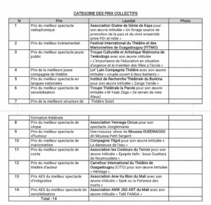 Des prix d’honneur et distinctions spéciales ont également récompensé les figures emblématiques du théâtre burkinabè. Le ministre de la Communication, de la Culture, des Arts et du Tourisme, Pingdwendé Gilbert Ouédraogo, représentant le chef du gouvernement, patron de cette édition a salué la persévérance des professionnels du secteur.