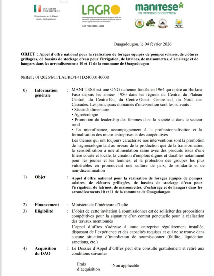 | Le dossier d’appel d’offres (DAO) peut être retiré à l’adresse suivante : Bureau de Mani Tese. sis au quartier Wayalghin/Ouagadougou pas loin de SONACOF.geoloc :12.291485.-484786, Tel 56 50 53 76. Pour des informations complémentaires veuillez écrire à l’adresse mail christsebego@gmail.com et en copie burkinafaso@manitese.it en utilisant l’objet :