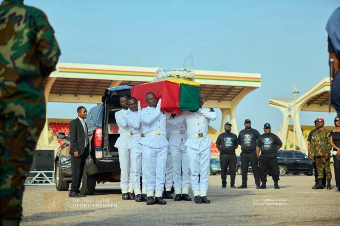 La cérémonie d’adieu, à laquelle participaient des dignitaires venus de divers horizons d’Afrique et du monde s’est déroulée à la place Black Star Square (place de l’étoile noire ) d’Accra en présence du Chef de l’État du Ghana, le Président John Dramani Mahama.