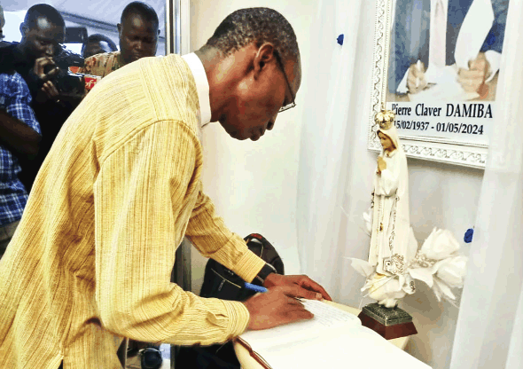 Après s’être recueilli sur le corps, présenté ses condoléances à la famille, le chef du gouvernement a laissé un message dans le cahier de condoléances dont la teneur suit : « Au cœur de nos mémoires et dans l’histoire de notre Nation, nous saluons la vie et l’œuvre de Pierre Claver Damiba, un homme dont la vision et le dévouement ont illuminé notre chemin vers un avenir plus prometteur. Né le 14 février 1937 à Koupéla et ayant rejoint les étoiles, le 1er mai 2024 à Ouagadougou, Pierre Claver Damiba restera à jamais un pilier de l’économie et de la politique burkinabè.