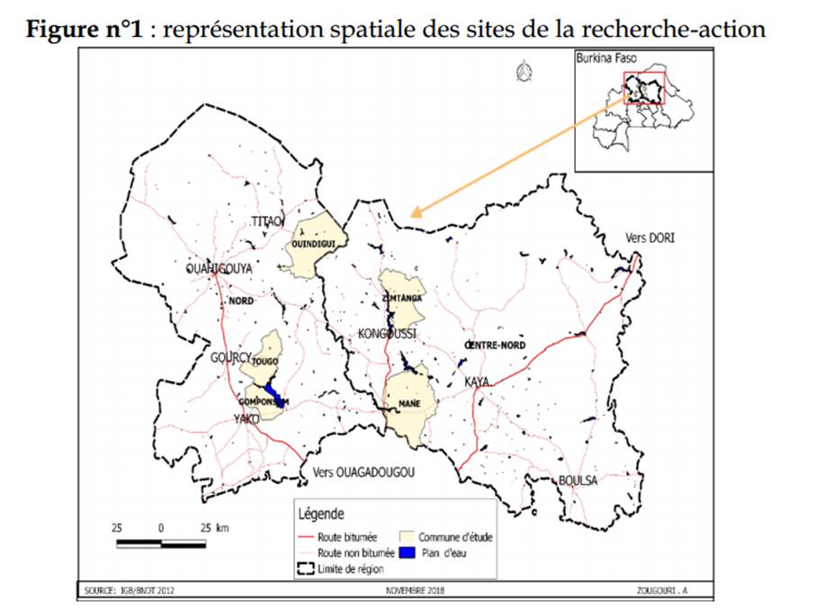 La méthodologie adopte une approche qualitative à travers un guide d’entretien comportant des thèmes et questions ouvertes adressée à dix-sept (17) producteurs, hommes et femmes, issus de deux (02) villages. Ces producteurs font du maraichage dans des bas-fonds et des retenues d’eau. Par ailleurs, Ils ont participé à des formations techniques du projet de construction des cases de conservation des oignons dans cinq (05) villages à forte production des régions du Yaadga et du Kuilsé du Burkina Faso. La carte illustre les zones bénéficiaires de la case de conservation.