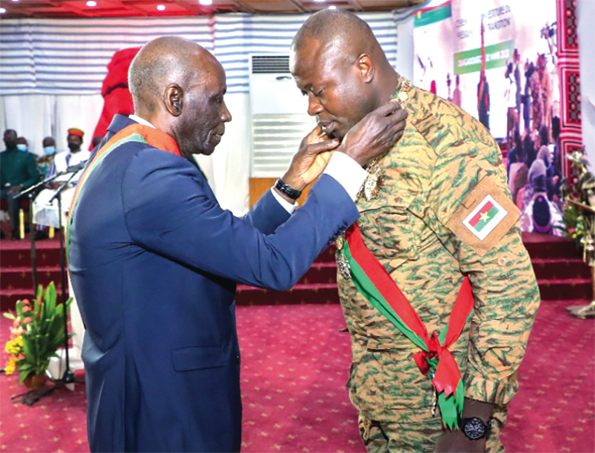« Nous vous reconnaissons comme Grand maitre des Ordres burkinabè », a déclaré le Grand chancelier des Ordres burkinabè après avoir porté le collier au chef de l’Etat. A issue de l’acte solennel, le président de la Transition a reçu respectivement les félicitations des présidents d’institutions du pays, des chefs de missions diploma-tiques et consulaires et des représentants des organisa-tions internationales et interafricaines. Outre ces personnalités, l’investiture de Paul-Henri Sandaogo Damiba a connu la participation des gouver-neurs de région, des hauts-commissaires, des membres de la commission technique chargée de l’élaboration de la Charte constitutionnelle de la Transition, des responsables de partis politiques et d’organisations de la société civile.