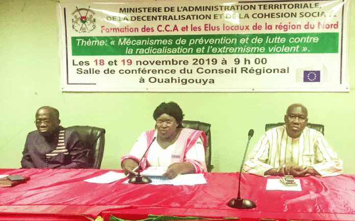 Venus des 31 communes de la région du Nord, les Chefs de circonscriptions administratives (CCA) et les élus locaux ont échangé durant 48 heures avec les spécialistes de l’extrémisme violent, de la radicalisation et de la préservation de la cohésion sociale au Burkina Faso. C’était les 18 et 19 novembre derniers à Ouahigouya, à l’occasion d’un atelier de formation initié par le ministère de l’Administration territoriale, de la Décentralisation et de la Cohésion sociale, à travers la Direction générale des libertés publiques et des affaires politiques (DGLPAL). A l’entame des travaux, le directeur des affaires coutumières et du culte, Bassy Abasse Ouédraogo, a expliqué que l’atelier se tient sous le thème : « Mécanismes de prévention de la radicalisation et de la lutte contre l’extrémisme violent », dans le cadre de l’action monitoring et le suivi de l’évolution des dynamiques religieuses dans les zones sensibles et à risque. Le haut-commissaire de la province du Yatenga, Kabou Séni, a signifié que le Nord est l’une des régions sensibles aux phénomènes de la radicalisation et de l’extrémisme violent. « Cet atelier est une bonne occasion qui permettra aux CCA et élus locaux qui sont sur le terrain, de mieux accomplir leur mission dans le cadre de la lutte contre l’insécurité. J’invite les participants, une fois de retour dans leurs circonscriptions administratives, de bien vouloir mettre en œuvre les acquis et contribuer à sensibiliser les autres collaborateurs et les personnes ressources susceptibles de lutter contre l’extrémisme violent et la radicalisation dans les localités », a-t-elle laissé entendre.