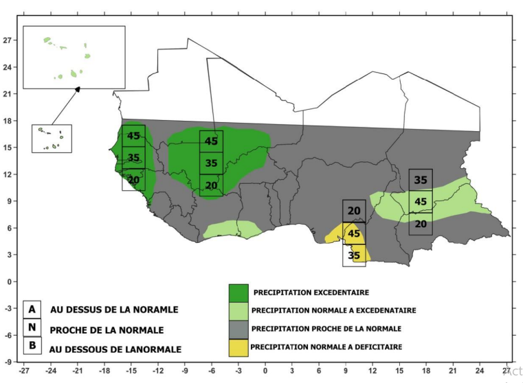 Au niveau du démarrage de l’hivernage, il est prévu des dates de début de saison précoces à moyennes sur le Sahel Ouest, y compris les îles du Cap Vert, et le Sahel Centre. Sur le Sahel Est et la bande soudanienne, les dates de début de la saison 2023 seraient plutôt globalement moyennes à précoces par endroit, notamment dans les parties Sud de la Sierra Leone, de la Guinée, du Mali, du Burkina Faso, du Tchad, sur l’extrême Est du Niger et les sur les parties Nord du Libéria, de la Côte d’Ivoire, du Ghana, du Togo, du Bénin et du Nigéria.