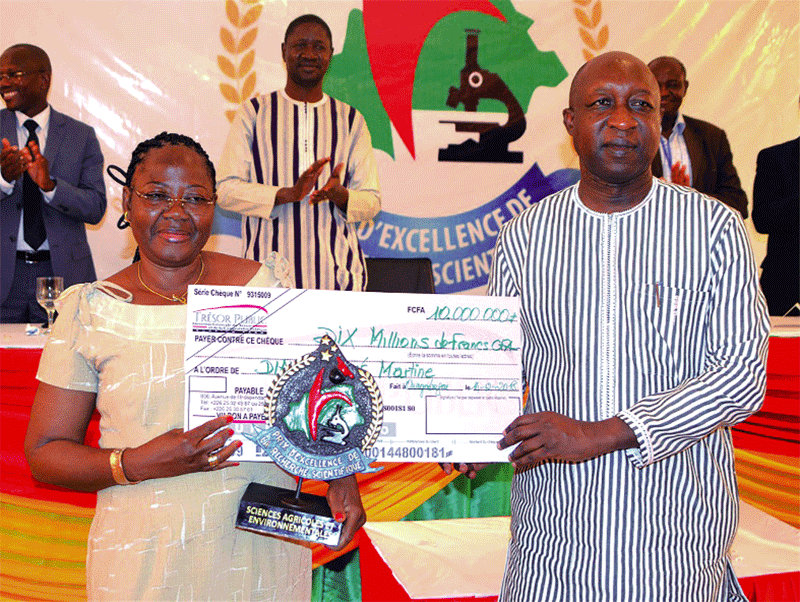 Martine Diallo/Koné de l’université Nazi- Boni de Bobo-Dioulasso est la lauréate de la 1re édition du prix d’excellence de la recherche scientifique et de l’innovation dans le domaine agricole et de l’environnement. En plus du trophée, elle a reçu un certificat et un chèque de dix millions F CFA. Ses mérites ont également été reconnus par la mairie de Bobo-Dioulasso qui lui a décerné un prix spécial composé d’un trophée, d’un certificat et d’un chèque d’un million F CFA.