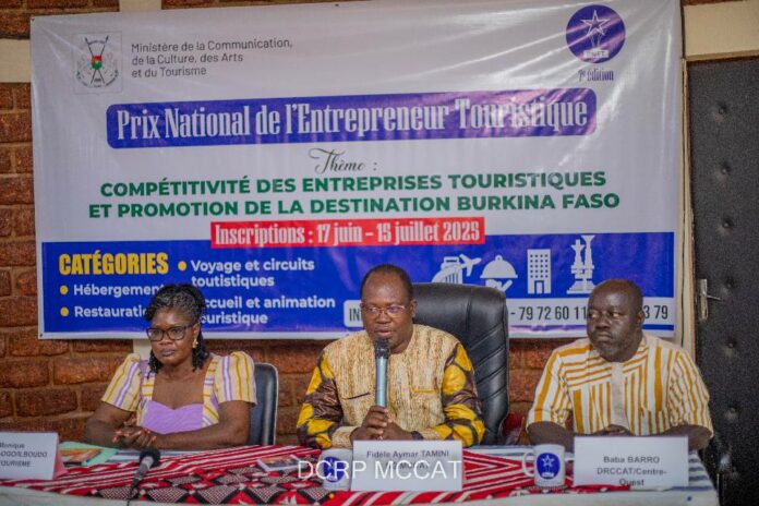 « Compétitivité des entreprises touristiques et promotion de la destination Burkina Faso » sera le thème de la 7e édition du Prix National de l’Entrepreneur Touristique (PNET).C’est qui ressort de la conférence de presse de lancement du PNET 2025 animée, ce mercredi 25 juin 2025 dans la ville de Koudougou, par le Secrétaire général du ministère de la Communication, de la Culture, des Arts et du Tourisme, Bètamou Fidèle Aymar Tamini, la Directrice générale du Tourisme, Monique Ouédraogo /Ilboudo et le directeur régional de la Communication, de la Culture, des Arts et du Tourisme, Baba Barro.