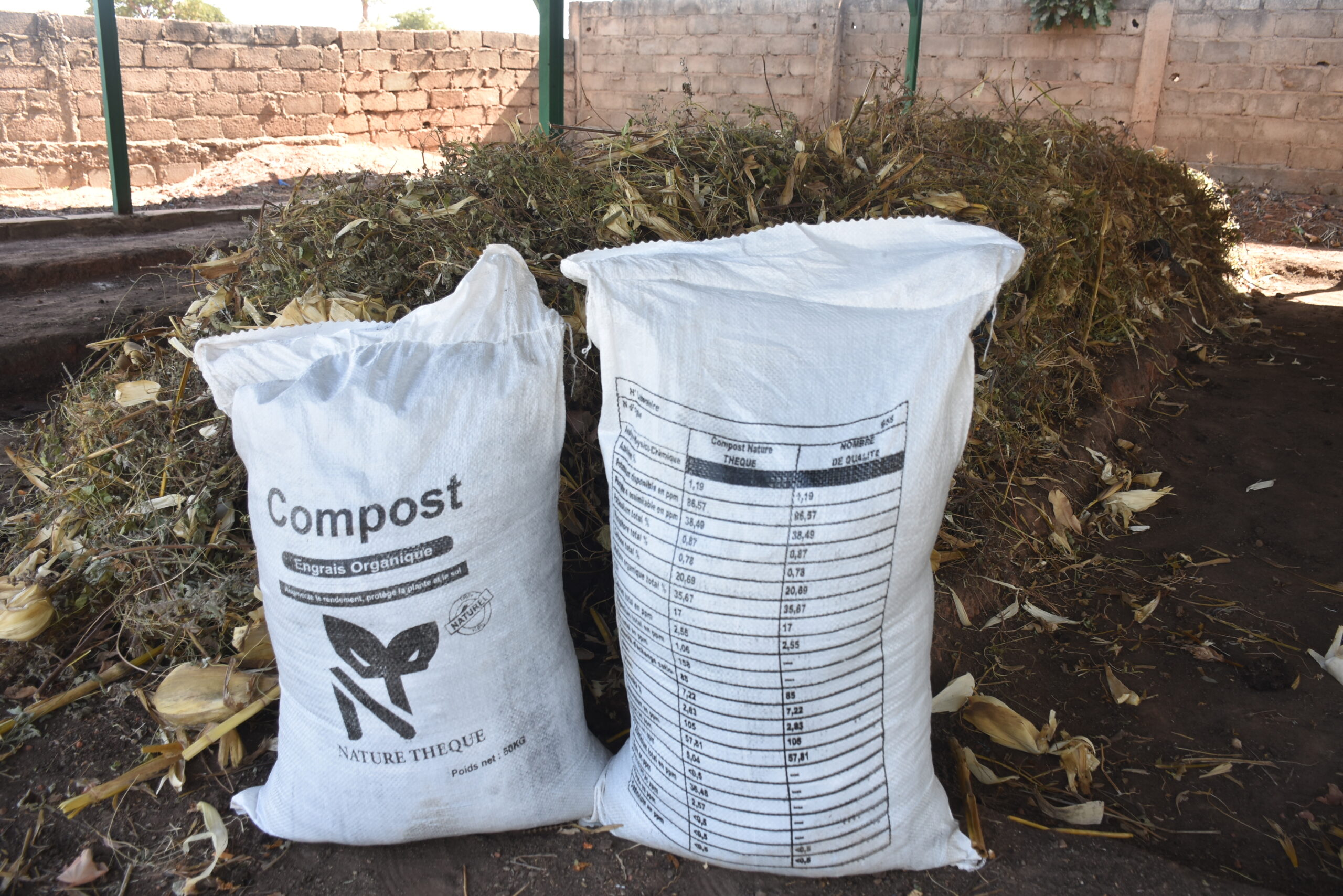 lisants (fumure organique et engrais organiques solides et liquides) de l’entreprise Nature Thèque appartenant à Yaya Yéo, à Tang-Zugu, à Loumbila dans la région de Oubri. La période de saison sèche profite bien au producteur et à son technicien Oudou Déné qui ramassent la biomasse (résidus de plantes issus de la récolte et des feuilles mortes) en plus de la bouse de vache et d’autres éléments, pour produire du compost ou fumure organique et des engrais organiques. Leur production est destinée aux agriculteurs agro-écologiques qui utilisent ces biofertilisants pour produire des fruits et légumes dans leurs champs.