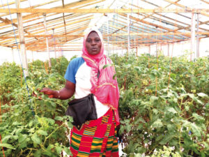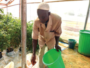 « Nous sommes à la fin de notre souffrance », se réjouit-elle d’avance. En effet, selon l’agent technique d’agriculture, Souleymane Ouédraogo, il s’agit de la production maraichère hors- sol sous serre. Concernant les aspects techniques de cette culture particulière, il explique que les bénéficiaires ont d’abord fait la pépinière de tomate. Trois semaines après la poussée des plants, ils les ont repiqués dans des pots, contenant des fibres de coco qui servent de support pour les plants afin de les nourrir et permettre leur croissance. « Nous avons deux serres et chacun contient environ plus de 800 pots sur un espace de 250m² », détaille l’agent technique d’agriculture. Après le repiquage, il faut arroser. Chaque plant doit recevoir par jour 300ml d’eau durant la première semaine, selon ses explications. « Avec des gobelets de 300ml, les femmes arrosent les plants trois fois par jour. Et la quantité d’eau demandée augmente au fur et à mesure jusqu’à atteindre 1000ml à la 4e semaine par plant, par jour. Ainsi, avec des gobelets de 1000ml, les bénéficiaires arrosent les plants trois fois par jour. Avant l’arrosage, elles stockent l’eau dans des fûts de 100L. De l’urée bio dénommée A et B est mélangée dans le fût pour l’arrosage .Pour l’urée A, il faut 18 cuillérées et le B, 14 », poursuit Souleymane Ouédraogo sur les détails relatifs à la production des plants. Pour leur traitement phytosanitaire, ajoute-t-il, c’est de l’huile de neem mélangée à du bicarbonate qui est utilisée. Le travail se fait par groupe de trois personnes. « Nous avons constitué huit groupes et chaque groupe est divisé en trois. C’est fait de telle sorte que chacun puisse arroser une fois dans la semaine.