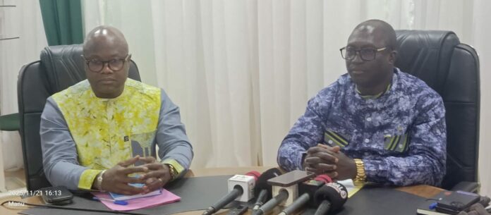 Le ministre de la Fonction publique, du Travail et de la Protection sociale, Mathias Traoré, assisté de son collègue de la Santé, Robert Lucien Kargougou, a aminé une conférence de presse pour donner des informations relatives à l’opérationnalisation du Régime d’assurance maladie universelle, vendredi 21 novembre 2025, à Ouagadougou.