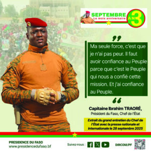AU COIN DU PALAIS Septembre, le mois anniversaire: une citation du Capitaine Ibrahim TRAORÉ Par JK. Sidwaya - 15 octobre 2025 FacebookTwitterPinterestWhatsAppLinkedinE-mailImprimerTumblrTelegramViberNaver