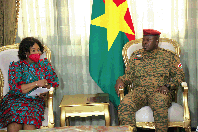Le Président du Faso, Paul-Henri Sandaogo Damiba, a reçu en audience, dans l’après-midi du jeudi 17 mars 2022, une délégation de la CEDEAO conduite par la présidente du Conseil des ministres de l’organisation sous régionale, Shirley Ayorkor Botchwey, par ailleurs ministre des Affaires étrangères du Ghana.