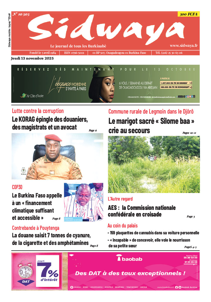 SIDWAYA QUOTIDIEN Sidwaya du 13-11-2025 Par JK. Sidwaya - 12 novembre 2025 FacebookTwitterPinterestWhatsAppLinkedinE-mailImprimerTumblrTelegramViberNaver