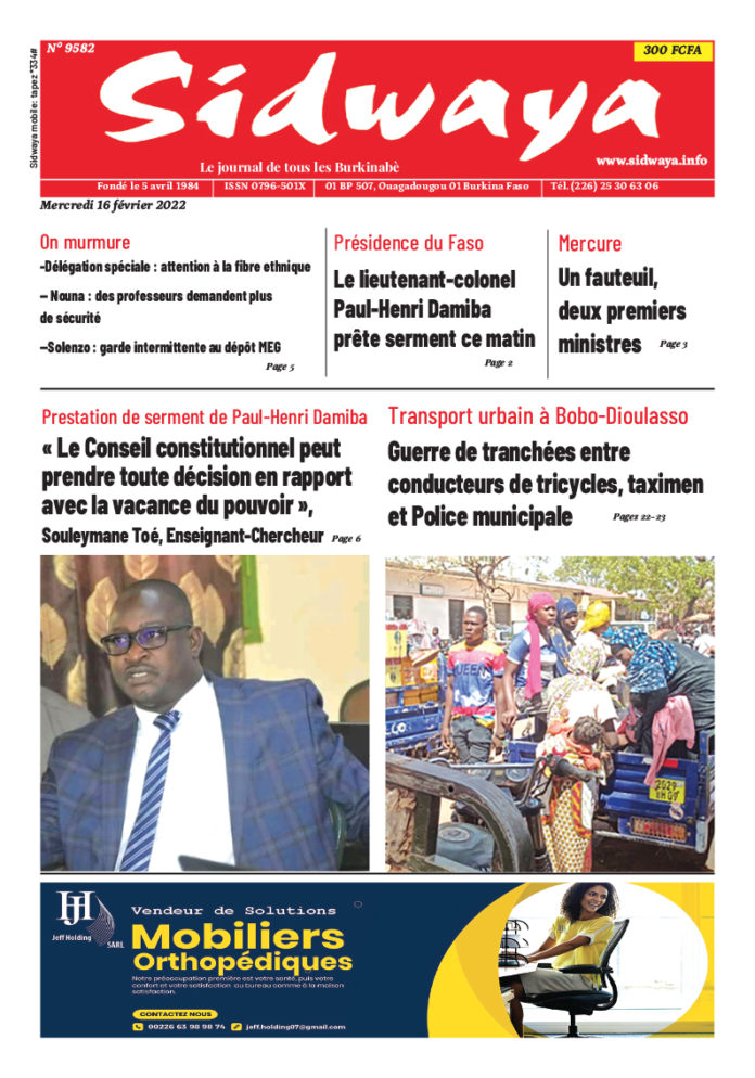 SIDWAYA QUOTIDIEN Sidwaya du 16/02/2022 Par JK. Sidwaya - 15 février 2022 FacebookTwitterPinterestWhatsAppLinkedinE-mailImprimerTumblrTelegramViberNaver