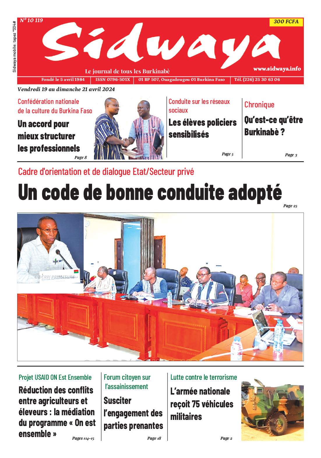 SIDWAYA QUOTIDIEN Sidwaya du 19 – 04-2024 Par JK. Sidwaya - 18 avril 2024 FacebookTwitterPinterestWhatsAppLinkedinE-mailImprimerTumblrTelegramViberNaver