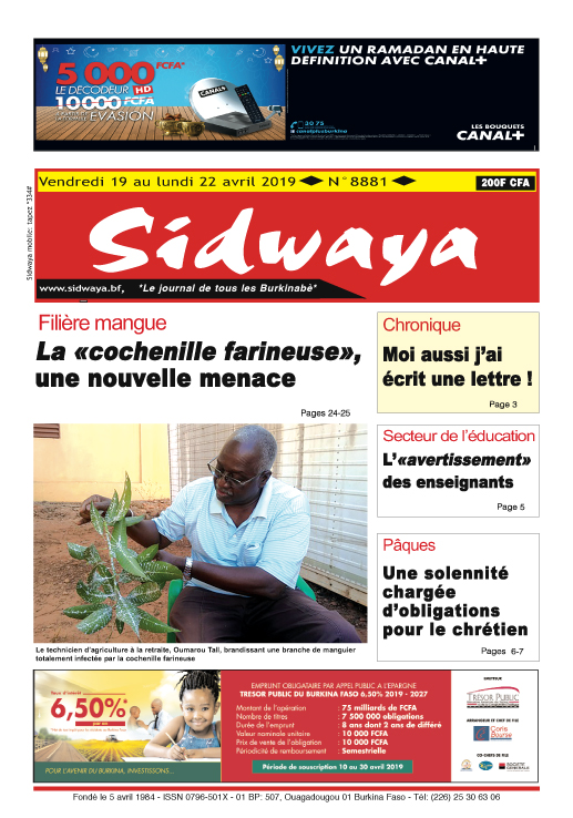 SIDWAYA QUOTIDIEN Sidwaya du 19 avril 2019 Par DD. Sidwaya - 18 avril 2019 FacebookTwitterPinterestWhatsAppLinkedinE-mailImprimerTumblrTelegramViberNaver