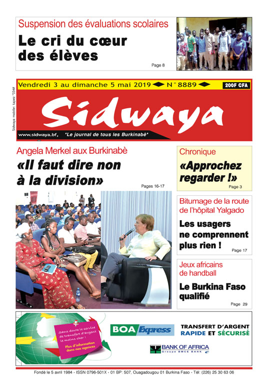 SIDWAYA QUOTIDIEN Sidwaya du 3 mai 2019 Par JK. Sidwaya - 2 mai 2019 FacebookTwitterPinterestWhatsAppLinkedinE-mailImprimerTumblrTelegramViberNaver