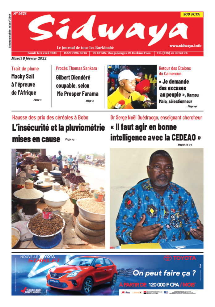 SIDWAYA QUOTIDIEN Sidwaya du 8/02/2022 Par JK. Sidwaya - 7 février 2022 FacebookTwitterPinterestWhatsAppLinkedinE-mailImprimerTumblrTelegramViberNaver