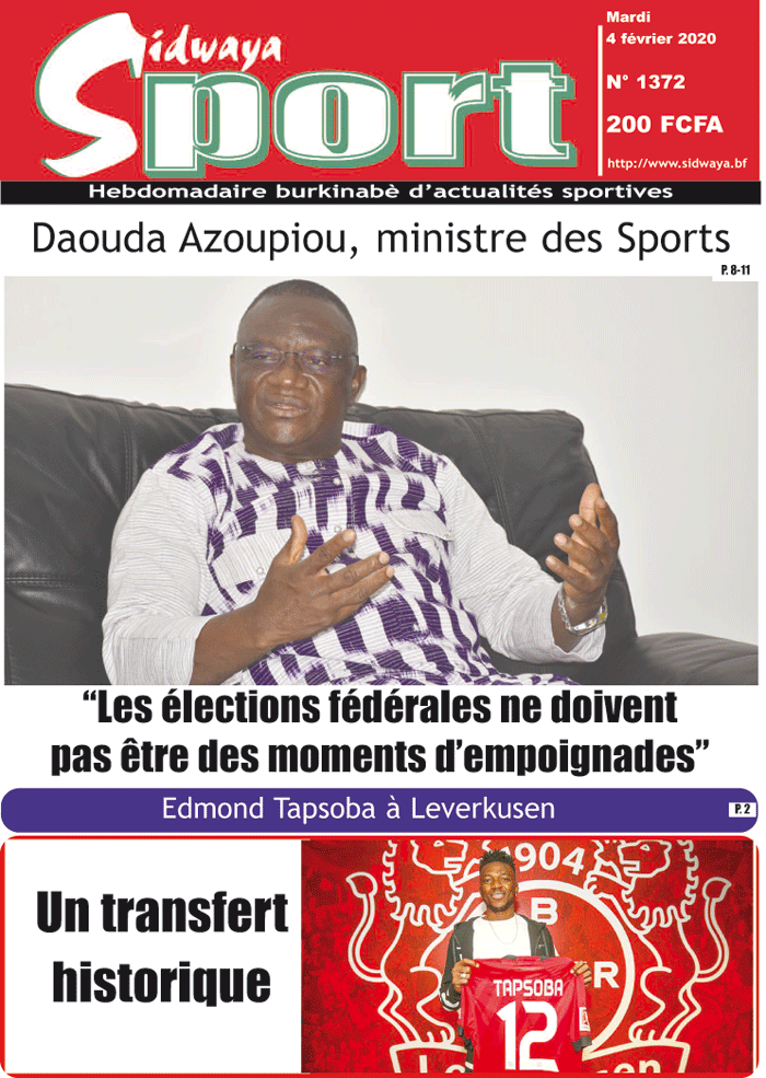 SIDWAYA SPORT Une Sidwaya Sport du 04 02 2020 Par JK. Sidwaya - 3 février 2020 FacebookTwitterPinterestWhatsAppLinkedinE-mailImprimerTumblrTelegramViberNaver