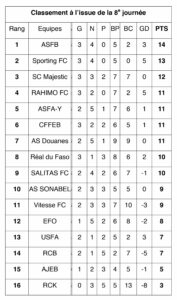 La Fasofoot Ligue 1 a donné rendez-vous à ses amoureux le weekend dernier pour le compte de la 8e journée. Vainqueur (1-0) de l’Association des jeunes espoirs de Bobo (AJEB), l’Association sportive des fonctionnaires de Bobo (ASFB) est provisoirement leader au classement.