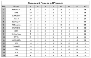 Le Fasofoot Ligue 1 a un nouveau leader. Vainqueur (2-0) de SALITAS FC, RAHIMO FC, champion en titre et avec deux matches en retard, prend les commandes du Fasofoot à l’issue de la 10e journée, disputée du 21 au 24 novembre dernier sur plusieurs stades à travers le pays.