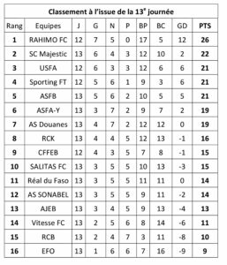 Le Fasofoot Ligue 1 a livré le verdict de sa 13e journée, du 11 au 13 novembre dernier. Tombée (0-1) face à CFFEB, l’Etoile filante de Ouagadougou (EFO) est désormais la lanterne rouge.