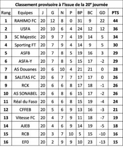Face au Rail club du Kadiogo (RCK), les Buffles de Sikasso-cira se sont inclinés, 0 but 2. Le bourreau des jaune et noir de Sya se nomme Junior Arnaud Yao (51e et 80e sp). CFFEB renoue avec la victoire. Face au Réal du Faso, le promu s’impose (4-0) lourdement grâce à des réalisations de Mamadou Sere (5e), Rasmané Ouédraogo (32e), Ashraf Zoromé (85e) et Sosthène Dipama (90e +1). Score d’un but partout au stade municipal de Banfora entre le Sporting FT et Vitesse FC. Enfin, score scores nuls et vierges dans les oppositions, SALITAS FC/AS SONABEL et AS Douanes/RCB.