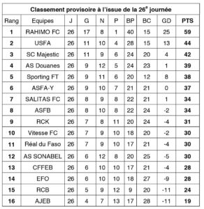 A ce stade, l’Etoile filante de Ouagadougou (EFO) semble avoir fait la bonne opération même si elle est toujours barragiste. Après son succès face à l’AS Douanes, les garçons du coach Boureima Kaboré enchainent. A la réception de SC Majestic au stade municipal Issoufou-Joseph-Conombo, les Stellistes ont pris le dessus en s’imposant (2-0) grâce à des buts signés Mohamed Lamine Sebgo (53e) et Benedict Ruan Minoungou (57e). Contraint au partage de points avec l’AS SONABEL, CFFEB demeure barragiste. Le Racing club de Bobo (RCB) version Ambass Ouédraogo renoue avec la victoire.