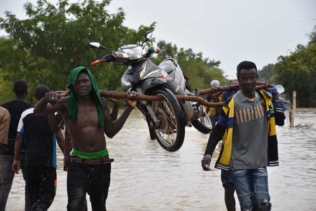 Dans la journée du mardi 13 septembre 2022, les eaux avaient déjà diminué mais ne permettaient toujours pas aux usagers de franchir la chaussée sans danger. C’est ainsi que les riverains ont décidé de voler au secours des usagers moyennant une certaine somme.