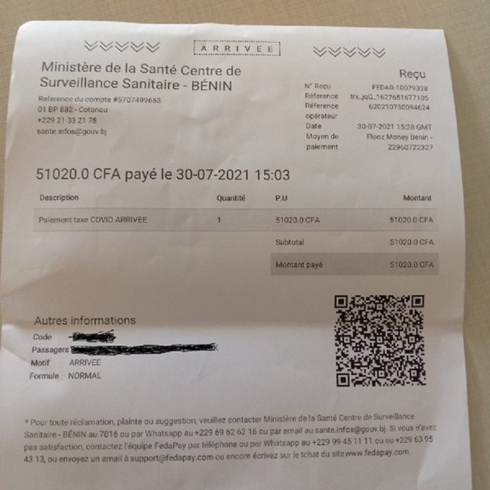 Aéroport International « Cardinal Bernardin Gantin » de Cotonou, vendredi 30 juillet 2021. Il est 14 h 05 minutes. L’avion de la compagnie Air Burkina, qui nous transporte depuis Ouagadougou avec escale à Lomé, vient d’atterrir au pays du vodou, cette religion de l’ancien royaume du Dahomey. Le temps est plutôt clément. La température affiche 26°C, dans ce pays côtier de 11, 8 millions d’habitants, selon un recensement de 2019. Elle tranche avec l’« écrasante » chaleur constatée habituellement à cette heure à Ouagadougou. Un accueil chaleureux nous est réservé au pied de l’appareil, un Embrayer 175. Nous répondons à une invitation pour participer à la célébration de la Fête nationale du Bénin, le 1er août. Un membre du salon d’honneur nous conduit immédiatement vers les chapiteaux géants climatisés dressés à l’aéroport, pour les tests PCR Covid-19. C’est un passage obligé, pour tout voyageur venant d’arriver sur le territoire béninois. La crise sanitaire est loin d’être finie et tous les Etats, moins ou plus touchés, restent vigilants. A la date du 26 Juillet 2021, le Bénin comptait 8394 cas confirmés, 8136 guéris et 108 décès, selon le ministère de la Santé. Sous les chapiteaux de test PCR, le voyageur fraichement arrivé tombe des nues. Première surprise : les agents de santé ne prennent pas le temps de vous demander le résultat du test Covid-19, réalisé dans votre pays de provenance, avant le vol. Ces résultats sont censés pourtant être reconnus dans les délais requis (cinq jours), en vertu d’une décision prise par les chefs d’Etats de l’Union économique et monétaire ouest-africaine (UEMOA), à l’issue d’un sommet tenu par visioconférence, le 25 mars 2021. Deuxième surprise : vous devez refaire un test à 51 020 F CFA, avant de sortir de l’aéroport et vaquer à vos occupations. Nous payons le montant requis contre une quittance qui comporte un numéro d’ordre. En fonction de ce numéro d’ordre, le voyageur est orienté vers un box précis pour le prélèvement, via un écran installé sur place. Après un peu de patience, nous sommes appelés au box 7. L’infirmière, un air taquin, effectue le prélèvement avec le long coton tige redouté (écouvillon), qu’elle enfonce au fond de notre narine droite. La sensation désagréable que ce geste produit est un enfer… « Vous aller recevoir le résultat du test sous 72 heures. Il est téléchargeable uniquement à l’adresse Internet : centresurveillancesanitaire.bj. », lâche-t-elle, avant de passer à un autre voyageur.