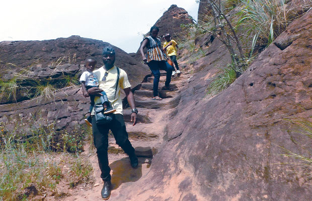A la différence de ce couple « expatrié », un autre et ses deux enfants, des nationaux, avec l’assistance du guide touristique, Amara Ouattara, s’annoncent pour la découverte des pics. Il s’agit de Sansogmé Alex Somé, son épouse, Fatima Yaro et leurs deux enfants, Océane et Socrate. Le tout-petit Socrate en mains, la casquette renversée, M. Somé, gestionnaire de stock d’une mine d’or, au-devant de sa famille, enjambe avec aisance les escaliers des pics. Il dit venir découvrir ce site touristique dont les échos dépassent les frontières du Burkina Faso. « Je n’avais jamais eu l’occasion de voir les pics, même si j’en ai entendu beaucoup parler. J’avoue que j’ai été émerveillé », indique-t-il avec joie. Tout essoufflée après avoir grimpé les rochers à une altitude de plus de 400 mètres, Fatima Yaro se réjouit aussi d’être venue sur les pics. Souvent à quatre pattes, poursuivant sa génitrice, Océane Somé, à peine dix ans, se dit « très contente » de découvrir les rochers sablonneux de Sindou.
