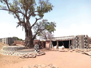 16h 30 mn. Le car étouffe son ronronnement devant la mythique cour royale de Tiébélé. « Elle a été inscrite récemment au patrimoine mondiale de l’UNESCO », s’empresse de relever un occupant du bus. Ce dernier est visiblement bien au parfum des conclusions de la 46e session du comité du patrimoine mondial à New Delhi en Inde, tenue le 26 juillet 2024. La rencontre avait validé en effet cette inscription souhaitée par la délégation burkinabè conduite par le ministre chargé de la culture et du tourisme d’alors, Rimtalba Jean Emmanuel Ouédraogo. Le guide Abou Bayeideina, prévenu de l’arrivée des touristes du jour, se lance dans la visite guidée des lieux. Les regards se portent, fiers et admiratifs, sur le savoir et le savoir-faire traditionnel exprimés à travers l’architecture et les peintures sur les cases et les murs de la cour. Sous la lueur du soleil couchant, le groupe disparait dans le labyrinthe formé des cases et des murs. Il passe ensuite quelque temps à découvrir l’intérieur de la case en forme de 8 couché de Kayè Tintama, la Trésor humain vivant (THV), une distinction honorifique donnée aux personnalités culturelles qui s’évertuent à la valorisation et la transmission de leur savoir et savoir-faire. Le crépuscule s’annonce à grands pas mais le groupe est décidé à profiter encore de ce saut dans le passé précolonial en territoire Kassena. Les photos s’invitent tout le long de la visite guidée. La magie de la fonction « appel vidéo » des smartphones permet à certains d’en faire profiter leurs connaissances à distance. La tournée du groupe dans les allées de la cour et à l’intérieur des cases s’achève enfin sur une sortie où des étals d’objets traditionnels et des documents sur l’histoire du palais sont proposés aux visiteurs.