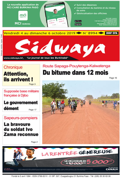 SIDWAYA QUOTIDIEN Une du 04-10-19 Par DD. Sidwaya - 3 octobre 2019 FacebookTwitterPinterestWhatsAppLinkedinE-mailImprimerTumblrTelegramViberNaver