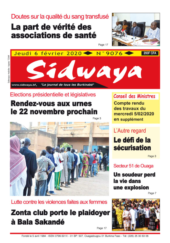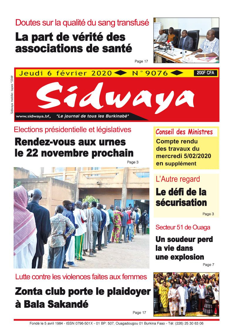SIDWAYA QUOTIDIEN Une du 06-02-2020 Par DD. Sidwaya - 5 février 2020 FacebookTwitterPinterestWhatsAppLinkedinE-mailImprimerTumblrTelegramViberNaver