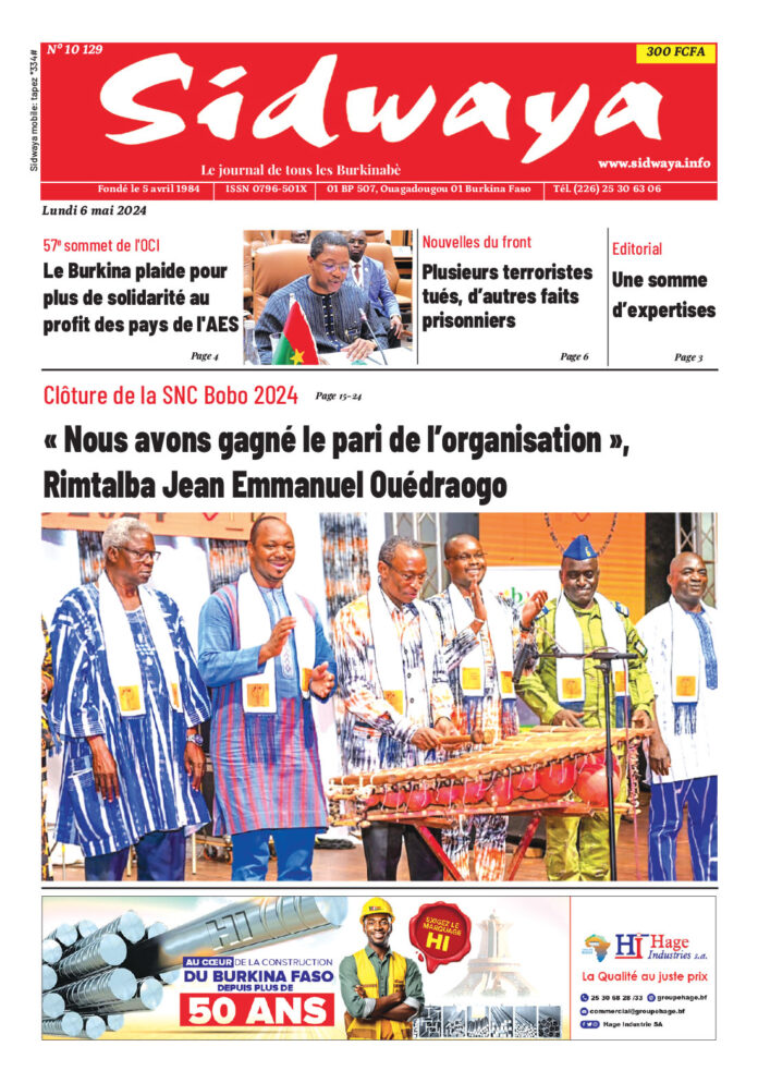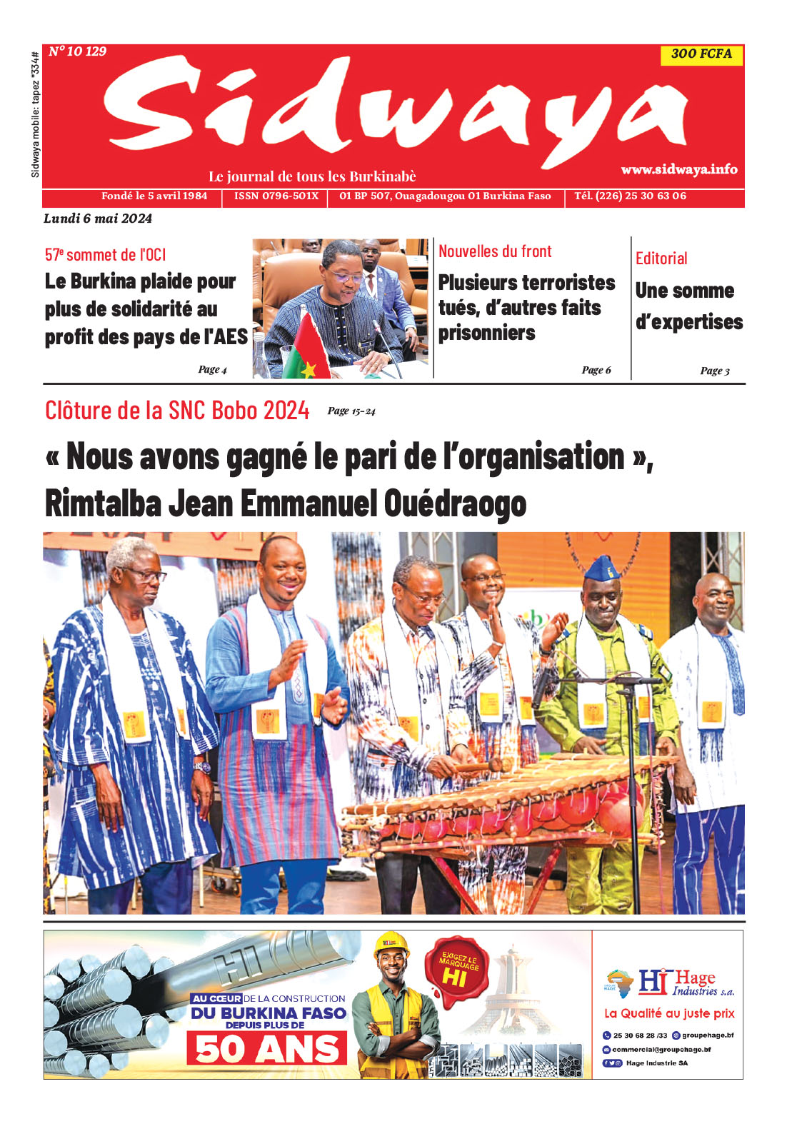 SIDWAYA QUOTIDIEN Une du 06-05-2024 Par JK. Sidwaya - 5 mai 2024 FacebookTwitterPinterestWhatsAppLinkedinE-mailImprimerTumblrTelegramViberNaver