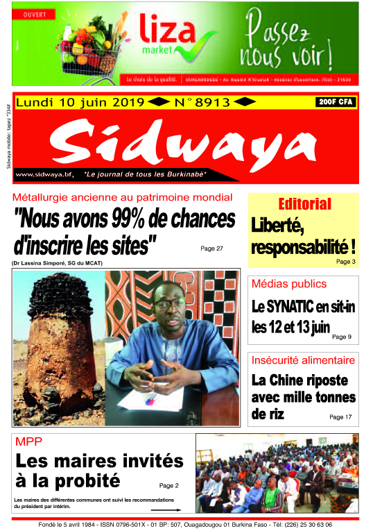 SIDWAYA QUOTIDIEN Une du 10 juin 2019 Par DD. Sidwaya - 9 juin 2019 FacebookTwitterPinterestWhatsAppLinkedinE-mailImprimerTumblrTelegramViberNaver