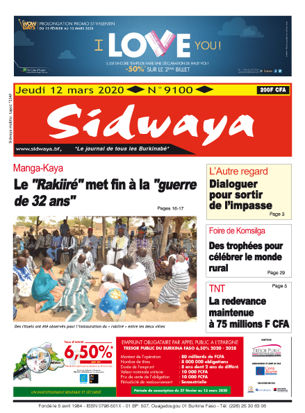 SIDWAYA QUOTIDIEN Une du 12-03-2020 Par DD. Sidwaya - 11 mars 2020 FacebookTwitterPinterestWhatsAppLinkedinE-mailImprimerTumblrTelegramViberNaver