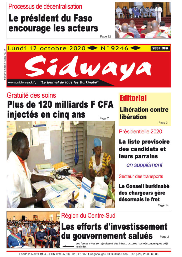SIDWAYA QUOTIDIEN Une du 12-10-2020 Par BM. Sidwaya - 11 octobre 2020 FacebookTwitterPinterestWhatsAppLinkedinE-mailImprimerTumblrTelegramViberNaver