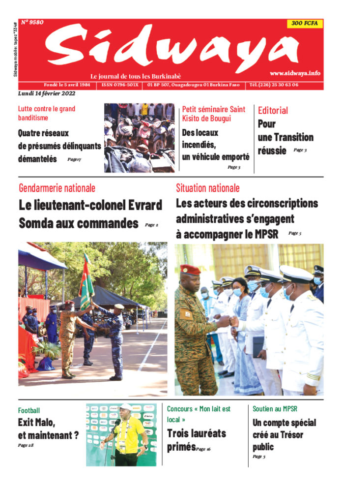 SIDWAYA QUOTIDIEN Une du 14/02/2022 Par JK. Sidwaya - 13 février 2022 FacebookTwitterPinterestWhatsAppLinkedinE-mailImprimerTumblrTelegramViberNaver
