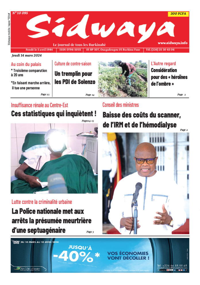 SIDWAYA QUOTIDIEN Une du 14-03-2024 Par JK. Sidwaya - 13 mars 2024 FacebookTwitterPinterestWhatsAppLinkedinE-mailImprimerTumblrTelegramViberNaver