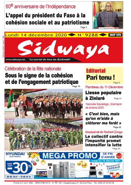SIDWAYA QUOTIDIEN Une du 14-12-2020 Par BM. Sidwaya - 13 décembre 2020 FacebookTwitterPinterestWhatsAppLinkedinE-mailImprimerTumblrTelegramViberNaver