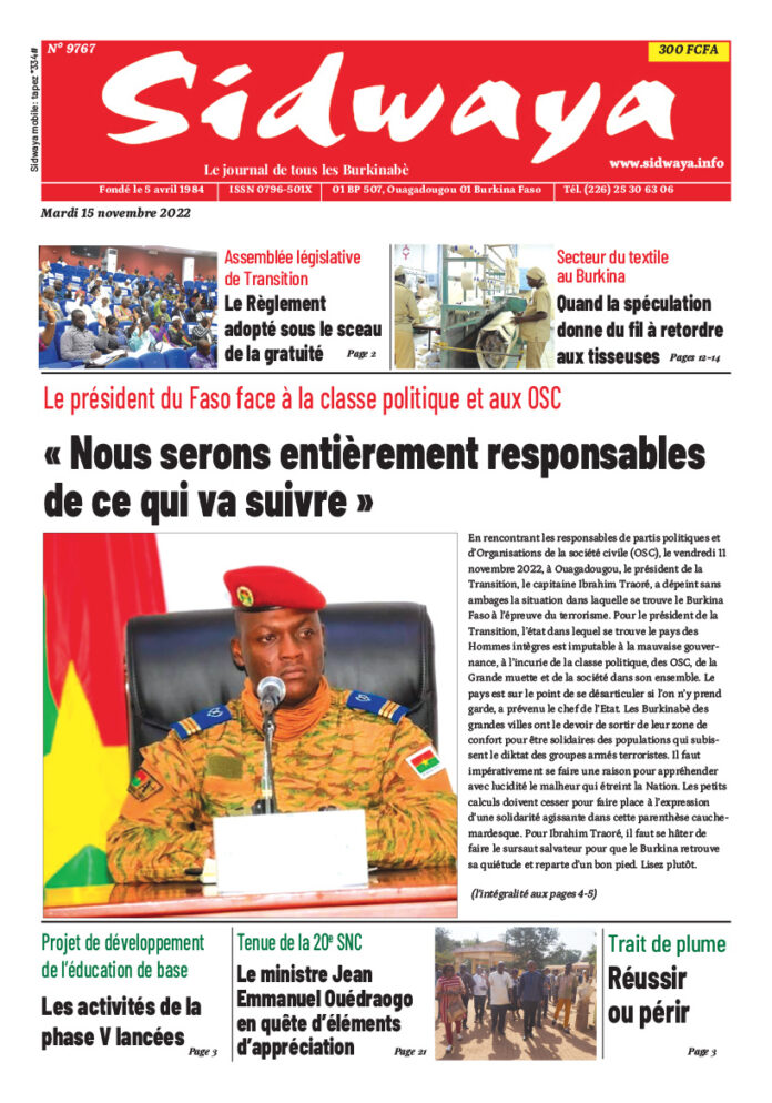 SIDWAYA QUOTIDIEN Une du 15/11/2022 Par JK. Sidwaya - 14 novembre 2022 FacebookTwitterPinterestWhatsAppLinkedinE-mailImprimerTumblrTelegramViberNaver