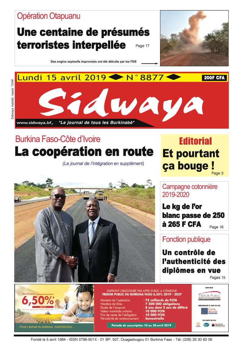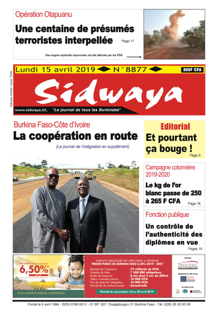 SIDWAYA QUOTIDIEN Une du 15 avril 2019 Par DD. Sidwaya - 14 avril 2019 FacebookTwitterPinterestWhatsAppLinkedinE-mailImprimerTumblrTelegramViberNaver
