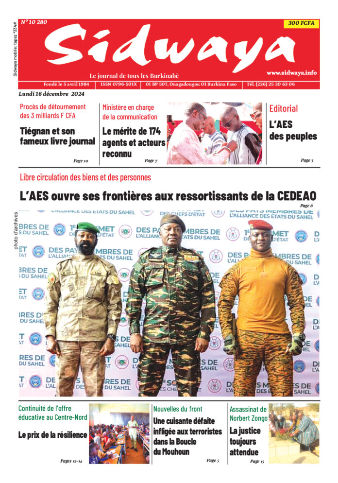 SIDWAYA QUOTIDIEN Une du 16-12-2024 Par JK. Sidwaya - 15 décembre 2024 FacebookTwitterPinterestWhatsAppLinkedinE-mailImprimerTumblrTelegramViberNaver